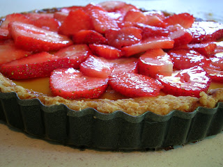 This post is about my first entry to Nicole at For the Love of Food's Taste and Create event. Every month she pairs participants up and they select and make something from each other's blog. This month Nicole has been kind enough to create a new seasonal edition of Taste and Create for a few of us who joined in late. I was partnered with Nicole herself, and have been having a difficult time choosing which of her many delicious-looking dishes to recreate. I was finally swayed towards a dessert as today was also my first meeting of a history journal's editorial board I've been asked to join, and I thought that there was no harm in banking some brownie points against any future tardiness in reviewing articles! The journal's editor puts on a nice salady outdoors lunch for the summer meeting, so I went for a fresh fruit tart Nicole said was so good she'd made it three times in one week. It was from an old cookbook of her mother's, and consists of a dough you 'pat in the pan' (ie no rolling), a custard filling, and a layer of fresh fruit. Nicole had made one big tart topped with a mixture of berries, but I went for two smaller ones (largely because the base of my big flan tin has never emerged from our house move!) and stuck with a strictly British spring-time seasonal theme of strawberries for one, and rhubarb for the other.